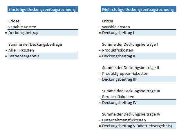 Dadurch ergibt sich eine Struktur, die eine Auswertung von Deckungsbeiträgen auf mehreren Ebenen erlaubt. Die erste Ebene, nach Abzug der variablen Kosten, wird dann als Deckungsbeitrag I bezeichnet, die weiteren Ebenen nach Abzug der Produkt-, Produktgruppen-, Bereichs- und Unternehmensfixkosten werden dann entsprechend mit Deckungsbeitrag II, III, IV und V bezeichnet. Der Deckungsbeitrag V ist dann wieder identisch mit eurem Betriebsergebnis aus der einstufigen Deckungsbeitragsrechnung.