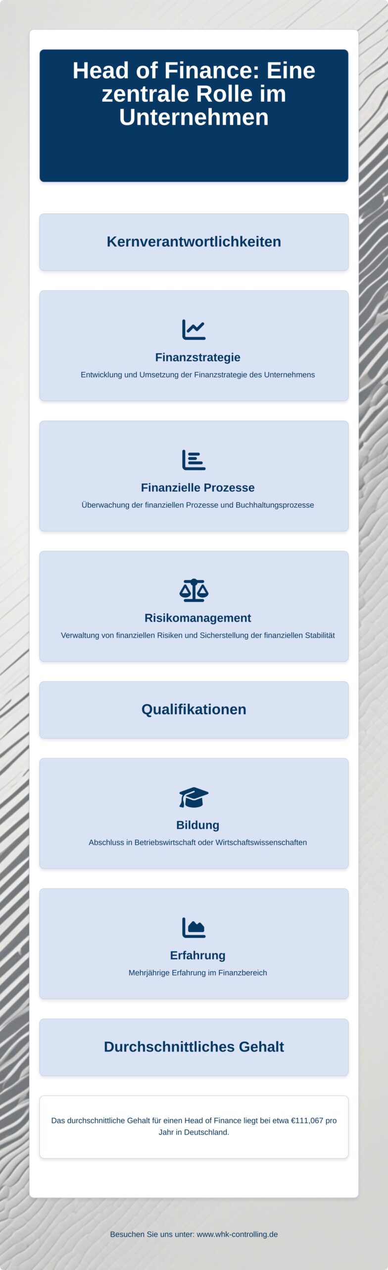- Ein Head of Finance ist verantwortlich für strategische Finanzplanung, Überwachung der Finanzen, Beschaffung von Mitteln und Führung des Finanz- und Controllingbereiches und trägt maßgeblich zum Erfolg des Unternehmens bei.