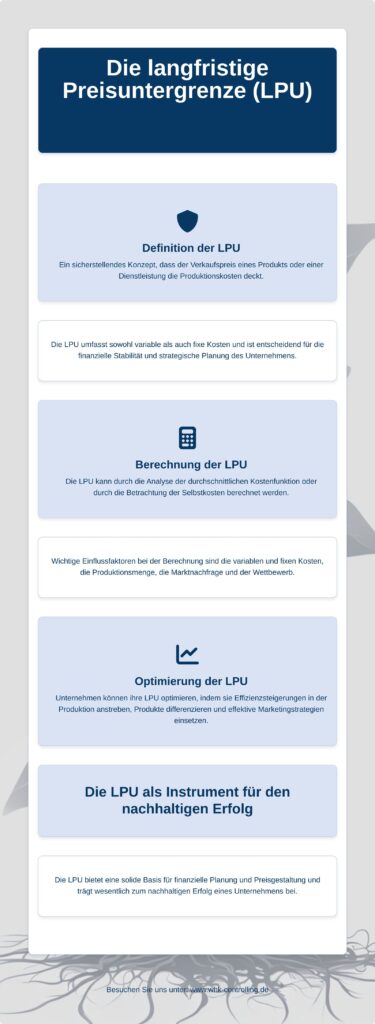 Die langfristige Preisuntergrenze (LPU) ist ein entscheidender Faktor für die finanzielle Stabilität eines Unternehmens. Sie stellt sicher, dass der Verkaufspreis eines Produkts oder einer Dienstleistung mindestens die Produktionskosten deckt. Die Berechnung der LPU kann auf verschiedene Weisen erfolgen, abhängig von der Kostenstruktur des Unternehmens.